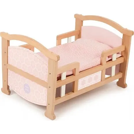 Få din dukke til at sove i denne flotte dukkeseng, kan laves om fra en vugge til en almindelig dukkeseng. Hvis man har to af dem kan du lave en køjeseng.Der medfølger sengetøj (3 dele)