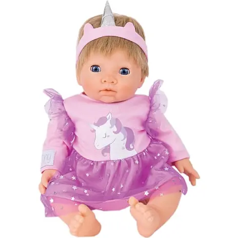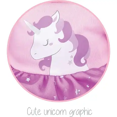 Kjolen har et printet unicorn motiv på front, flæser på ærmer, og et dobbelt skørt med yderste lag i net med printede sølv metal stjerner. Til kjolen medfølger selvfølgelig det sødeste unicorn hårbånd – Din dukke bliver bare så fin til festen. 3+ år