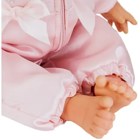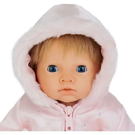 Tiny Treasures lyserød skidragt med sløjfer, og hætte med plys kant vil holde din baby varm i koldt vejr. Så tag du bare din baby med ud på tur. Din Tiny Treasures dukke vil elske sin nye skidragt!