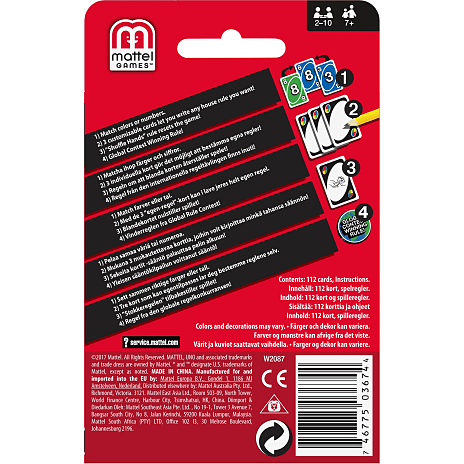 UNO™, det klassiske kortspil med farver og tal, der er nemt at lære…men umuligt at lægge fra sig. Fås nu med brugerdefinerede jokere for endnu mere spænding! Spillerne konkurrerer om at slippe af med alle deres kort ved at matche et kort på hånden med det kort, der ligger i toppen af bunken. Specialkort giver spændingsøjeblikke i spillet og hjælper med at trumfe modstanderne! Spil “byt hånd”-kortet for at bytte hånd med en modstander, og lav nye regler med de 3 “egen regel”-jokerkort, der kan brugerdefineres (og slettes)! Spillet indeholder 19 kort i hver farve (rød, grøn, blå og gul) plus 8 “træk to”-kort, “tilbage”- og “spring over”-kort i hver farve, samt 4 jokere, 4 “træk fire”-jokere, 1 “byt hånd”-joker og 3 “egen regel”-jokere. Hvis du ikke kan lave et match, skal du trække fra midterbunken! Og husk at råbe “UNO!”, når du kun har ét kort tilbage! Den spiller, der først slipper af med sine kort, får point for de kort, modspillerne har tilbage på hånden. Den spiller, der først når 500 point, har vundet. Get Wild 4 UNO!™ indeholder 112 kort og en vejledning. Farver og mønstre kan afvige fra det viste.